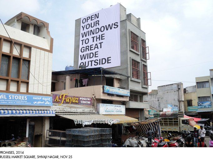 Oversized ‘promises’ in the form of real estate advertisements are promoting thenew city along the lines of global real estate and living standards. ‘The perfectunion to all you desire’ and ‘We believe luxury is best served in small quantities’, first seen along Varthur Road in Whitefield, Bangalore, caught my attention. Questions emerged about the Indian caste system, the sense of community, modesty and personal goals. The design of this urbanity also reminds me of earlier journeys to the United Arab Emirates and Shanghai. The new urbanity becomes exchangeable, custom-tailored and its ‘ultra-luxurious villas’ accessible ‘for the chosenfew’ of the Pepsi Generation. By situating these promises minus their glossy animated illusions in gaps between buildings and empty wall space in middle class central residential areas of Bangalore, the community is confronted with the new urbanity, designed for the upwardly mobile suburban society. (Quelle: Bangalore Mirror, Dec. 7, 2014)