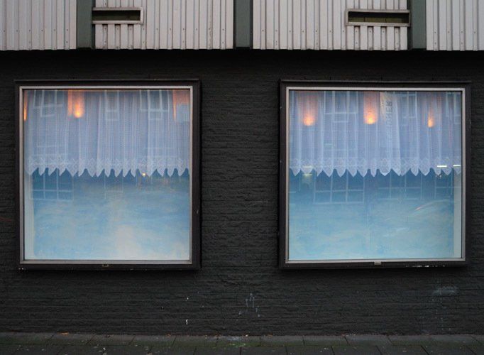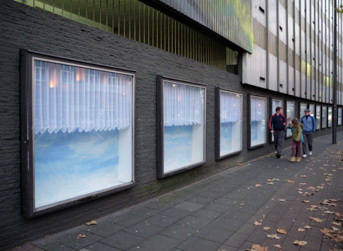 Weite Landstriche unterliegen der Effizienz. Die 13 weißen Bistro-Gardinen leiten die funktionale Blechverkleidung der Parkhausfassade über in Schwung und Gegenschwung. Eine Form des Barocks. Weiße Gardinen vor blauen Himmel. Wieder ein Versprechen, so denke ich. Spot on