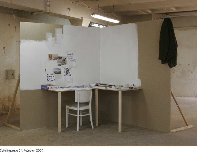 2 Stellwände, 1 Schreibtisch, 1 Bürostuhl, 3 Stühle, Büropflanze, Beistelltisch, diverse Magazine, Wandkalender (Aldi), Kunstdruck (DIN A2, gerahmt), altes Ausstellungsposter, Zettel (DIN A4), Mobiltelefon, Luftballons (farbig), Anzeige, Schnur.