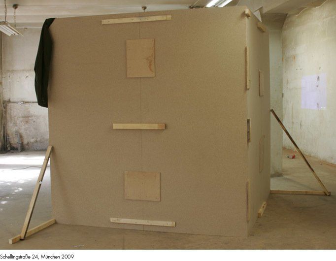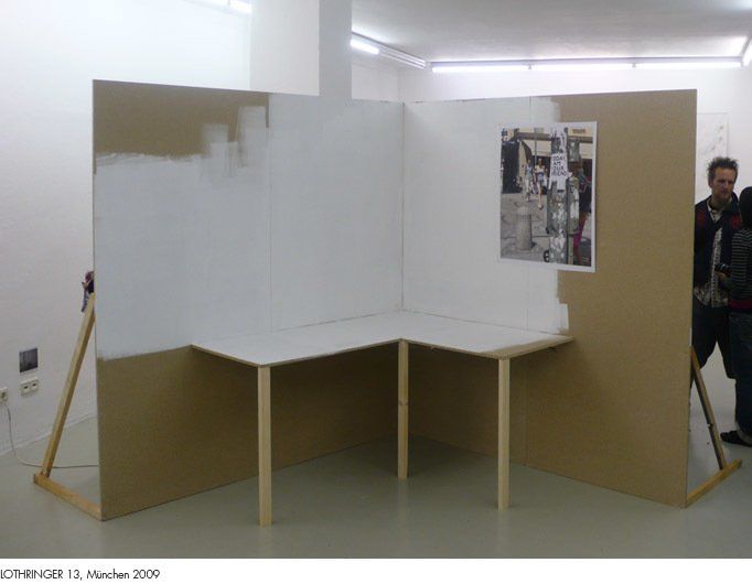 empty shop, cupboard, wood leftovers from construction sides, white wallpaint, chair, A4 colored posters, local newspaper, facebook, cell phone, u-stream live broadcasting, 400 x 200 x 289 cm
