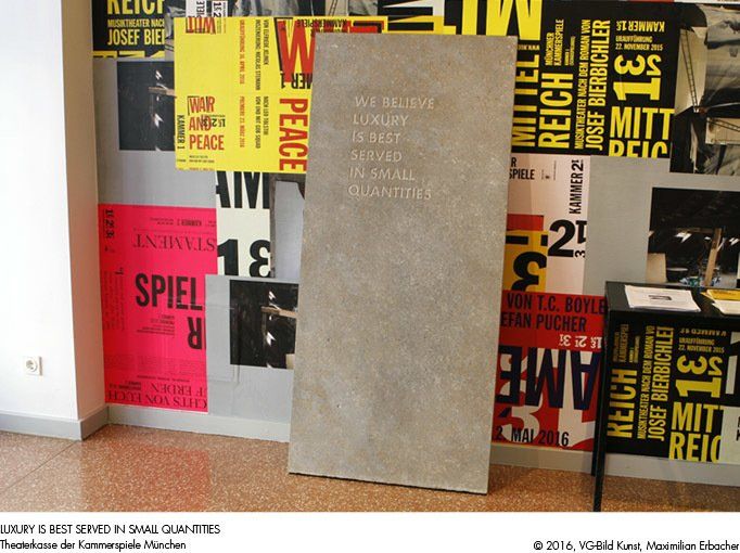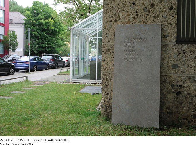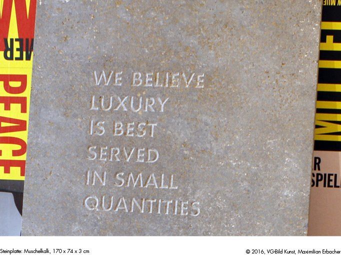 LUXURY IS BEST SERVED IN SMALL QUANTITIES ist eine zweiteilige Arbeit, bestehend aus einer Fahne und einer Steinplatte.